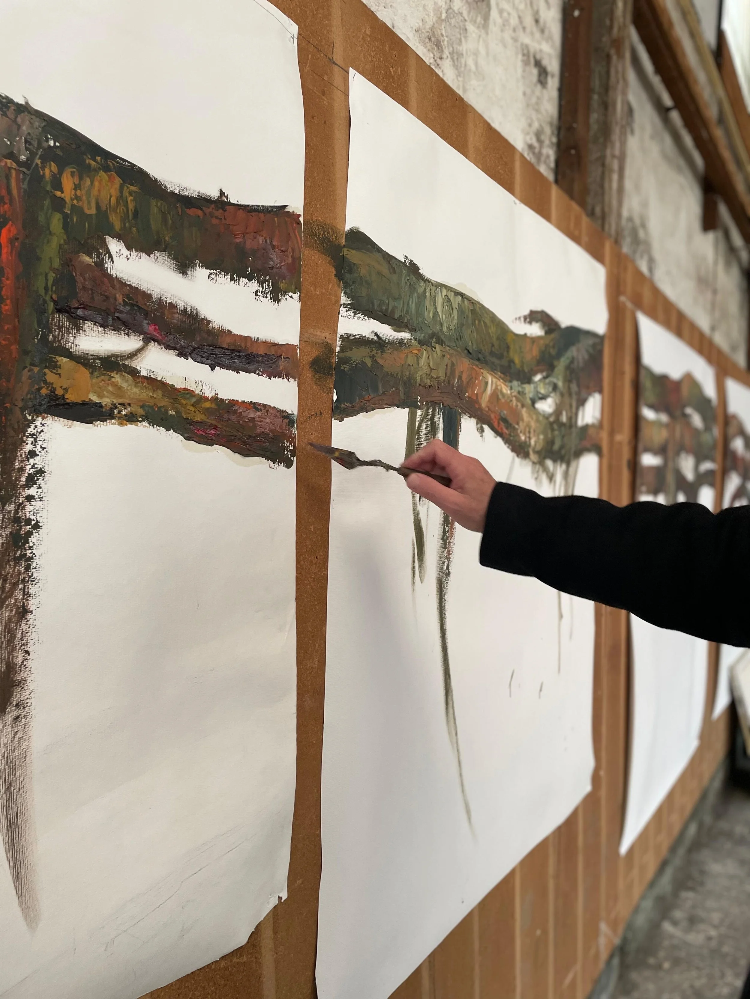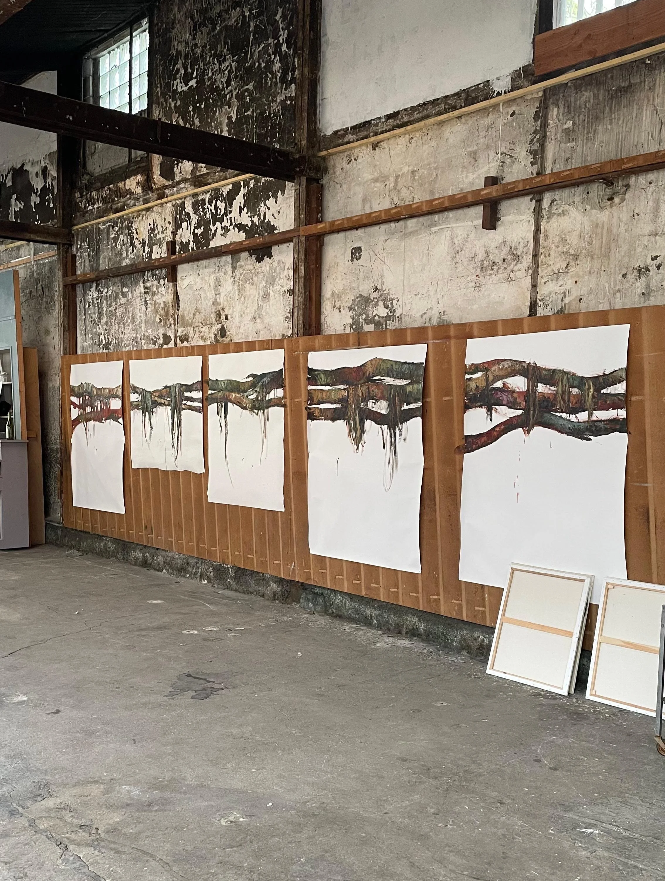 Selva Adentro is the continuation of a series of large-format paintings that the artist began creating in Colombia during the pandemic. This series initially bore the title Nomen Nescio, without a name. In it, black and white dominate the composition, carrying emotion into a solemn, restrained aesthetic space: a cold, neutral realm, a limbo in which tensions and ruptures give form to absence, to emptiness. That which has no name, yet persists as a tangible and symbolic presence.