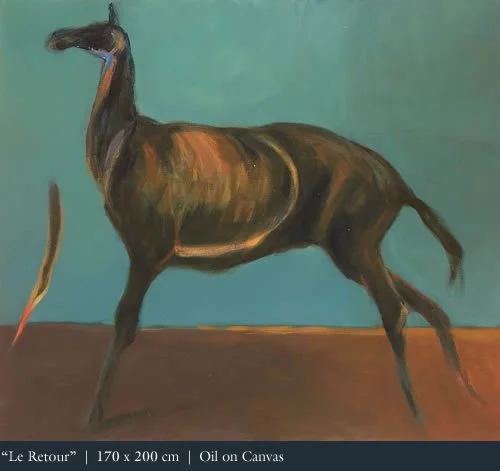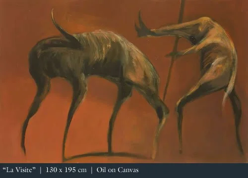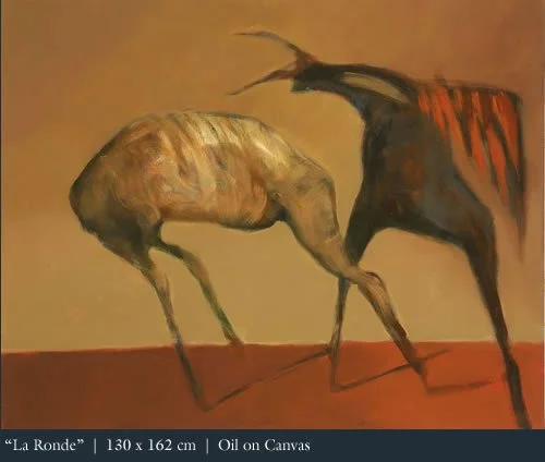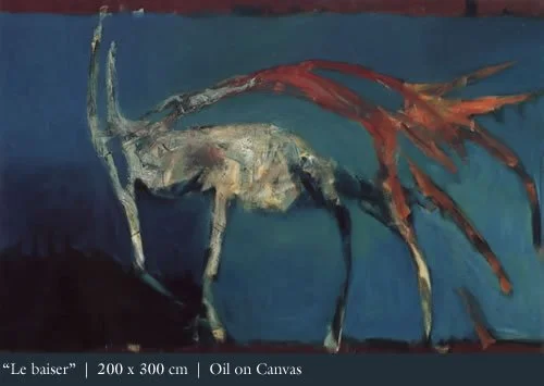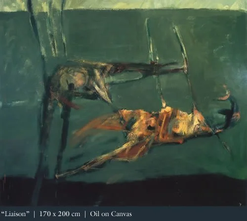 “Liaisons” is the theme of this series of Arturo Denarvaez's work. Protagonists are abstract strange beasts, bulls, horses, or matadors acting with great energy and passion. Love, hatred, lust, violent kiss, fight, happiness, rest, death, hunt, ardent desire and enigmatic face to face are expressed with the impetuousness and warmth of the artist's Colombian origins. The deep and warm colours as well as the strength of the movements give to Denarvaez's works a striking force and unusual beauty.