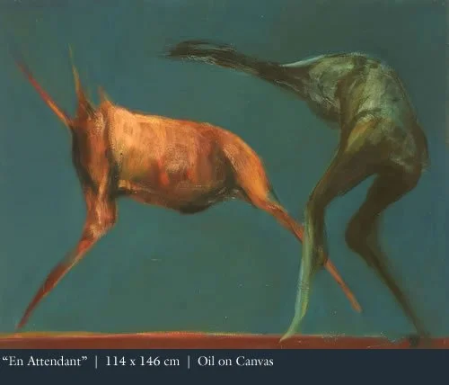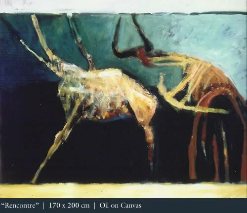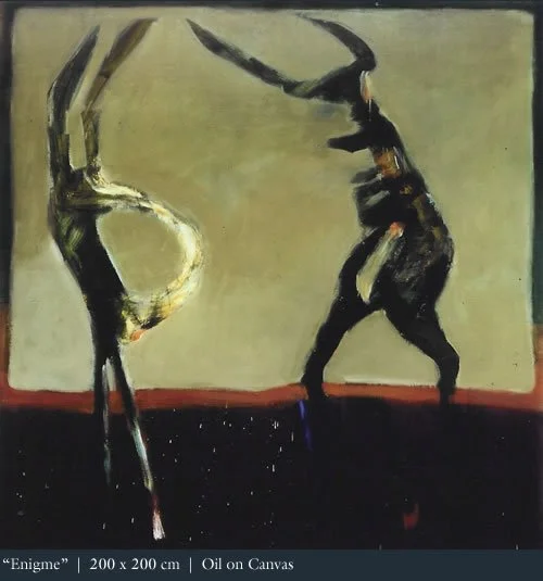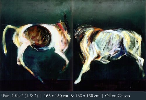 Animal and humans are often combined in the artist's works. They can become one as in the 1984 "Centaurs" paintings. They can be associated to perform heroic deeds as shown in the "Saint George" series of 1988 and 1989. They can also be in mortal combat. This is the subject of the works presently shown. Phantom bulls and matadors confront each other. The figures, although charged with energy seem suspended in an unreal and twilight world. Both man and beast are fighting for their lives. However, the subjects and objects found in other Denarvaez's paintings may shed a different light on the current works. The "Skulls" of 1990, the mirrors present in some of the 1993 "Nudes" (humans stripped of all their earthly trappings) are all "Vanities". Perhaps, therefore, it is not life which is so important but something more profound, its very essence, in this case liberty. Perhaps the combat is derisive even vain, it is nevertheless truly essential. The pursuit of liberty must be continued and the cruelty of those who oppose it must be denounced. The works of Arturo Denarvaez do this with force and beauty.